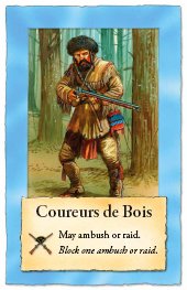 How do the different sides approach ambushing? Well, this is one area of the game where the French have a huge advantage. They have a blue Native American card which means that it can't be hit by the Indian Leader and that they have access to one more ambusher total. The French have access to 2 Priests compared to the 1 Indian Leader the British have. The French Militia cards actually block ambushes and raids while the British Militia are vulnerable to ambush. Beyond that they each have access to the 5 neutral Native Americans and they each have an ambusher that is free. (Rangers and Coureurs de Bois.)