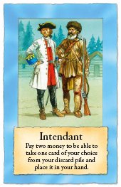Intendant - This is a French only card. I don't know how I really feel about it. I rarely end up buying it and tend to regret buying it when I do. The biggest problem with it is how much it costs for the regrowth effect. 2 bucks and an action is a huge price to pay! It does have some interesting uses. You can buy a card with your first action and then immediately pick it up with your second. (Only really useful with the military leader or a raid/ambush blocker.) You could have bought a military card in a previous turn (or had a fight just end), pick up your siege artillery, and go to town with it. You can use it to run home support a second time. If the French is trying to end the game with disks it can really help to be able to recycle a settler card. It's even quite feasible to take a new location with your first action and then intendant it up as your second action. Then next turn you're ready to disk a location you didn't even have a cube in the turn before! You could also use it to quickly launch invasions. Win a fight in Pemaquid for example, and you can pick it up with your first action and launch an attack on Boston with your second. Assuming you still have military cards in your hand after winning the first siege...