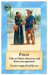 First of all, what is the other way to fight ambushes? Priest for the French and Indian Leader for the British. The two are functionally equivalent. You play one as an action and then if your opponent has one of the green Native American cards in their hand they have to give it to you. Otherwise they have to show you their hand. Both can be useful things to have happen especially since there is no monetary cost to playing the Priest. They can also be used in raids which will be covered in the next post.